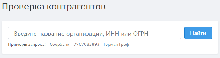 В появившемся окне поиска необходимо указать ИНН, ОГРН или наименование контрагента. Далее, нажать кнопку “Найти”