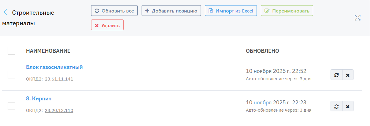 Пример. Создадим список товаров для мониторинга цен на строительные материалы. Добавим туда 2 позиции: Кирпич и блок газосиликатный.