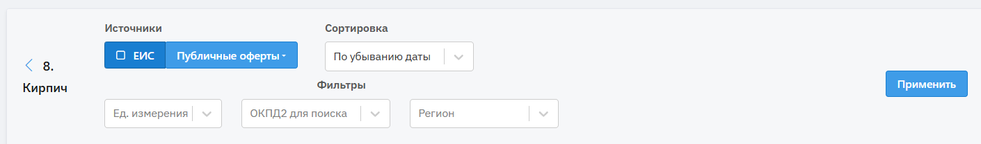 Нажав на конкретную номенклатуру для сортировки результатов можно выбрать Единицы измерения, Регион, Источники цен и Регион.