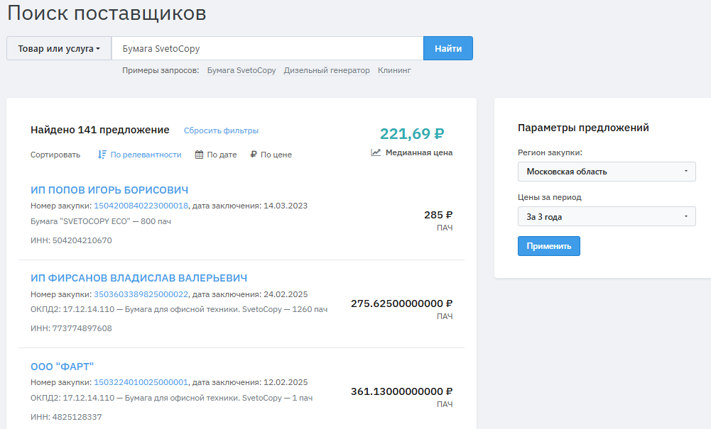 Система выдаст список поставщиков, которых можно отфильтровать по срокам поставки и регионам поставки.