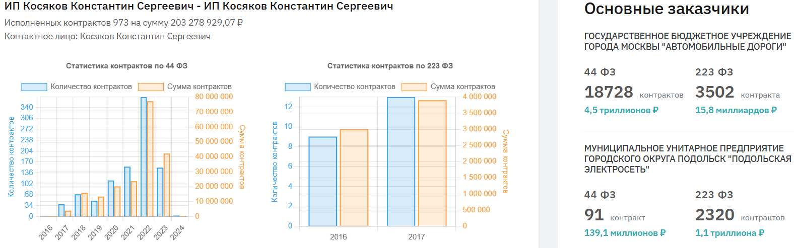 При нажатии на конкретного поставщика появится аналитическая информация по Поставщику: количество и суммы контрактов, основные заказчики по 44 и 223-ФЗ.